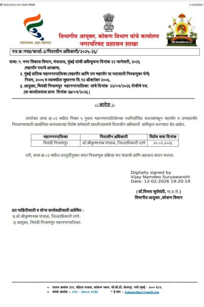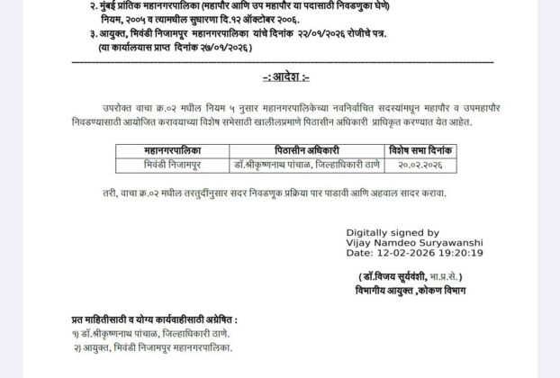 भिवंडी में महापौर-उपमहापौर चुनाव 20 फ़रवरी के लिए पीठासीन अधिकारी नियुक्त
