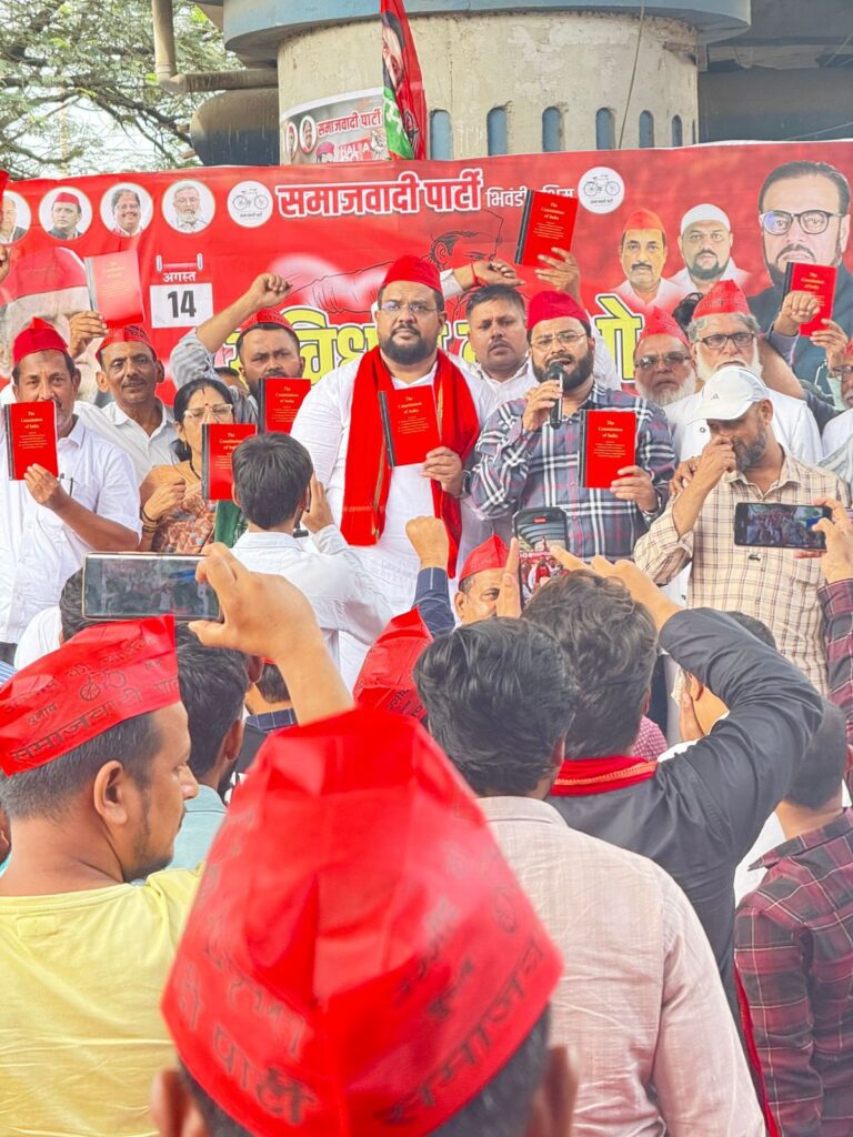 भिवंडी। समाजवादी पार्टी की ओर से 14 अगस्त को भिवंडी प्रांत कार्यालय के सामने संविधान बचाव धरना आयोजित किया गया। इस धरने का मुख्य उद्देश्य देश में उपजे वोट चोरी विवाद के खिलाफ आवाज़ बुलंद करना और संविधान की रक्षा के लिए जनजागरण करना था।