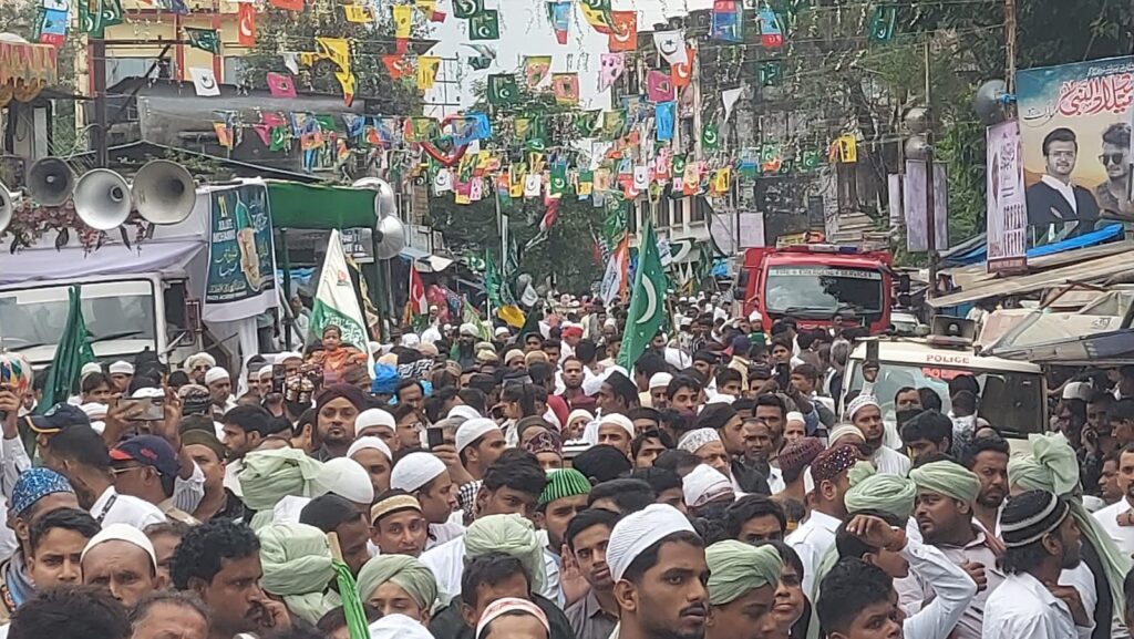 भिवंडी। पैगंबर-ए-इस्लाम हज़रत मोहम्मद ﷺ के यौमे विलादत (ईद मिलादुन्नबी) के पावन मौके पर सोमवार को भिवंडी शहर में रौनक और जश्न का आलम देखने लायक था। रज़ा अकादमी भिवंडी की जानिब से कोटर गेट मस्जिद से लेकर मिल्लतनगर स्थित मामा भांजा मैदान तक एक भव्य व ऐतिहासिक जुलूस निकाला गया, जिसमें शहरभर से लाखों जायरीन ने उत्साह और मोहब्बत के साथ भाग लिया।