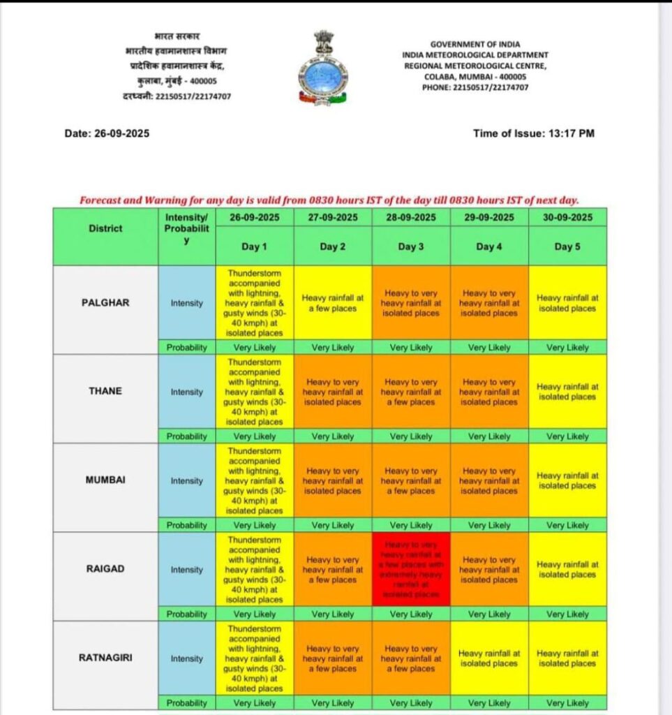 मुंबई एवं आसपास के क्षेत्रों में आज देर रात से लेकर सोमवार सुबह तक मूसलधार बारिश की चेतावनी जारी की गई है। मौसम विभाग के अनुसार इस दौरान गरज-चमक के साथ तेज़ हवाएँ चलेंगी तथा वर्षा की तीव्रता रविवार शाम को अपने चरम पर होगी।