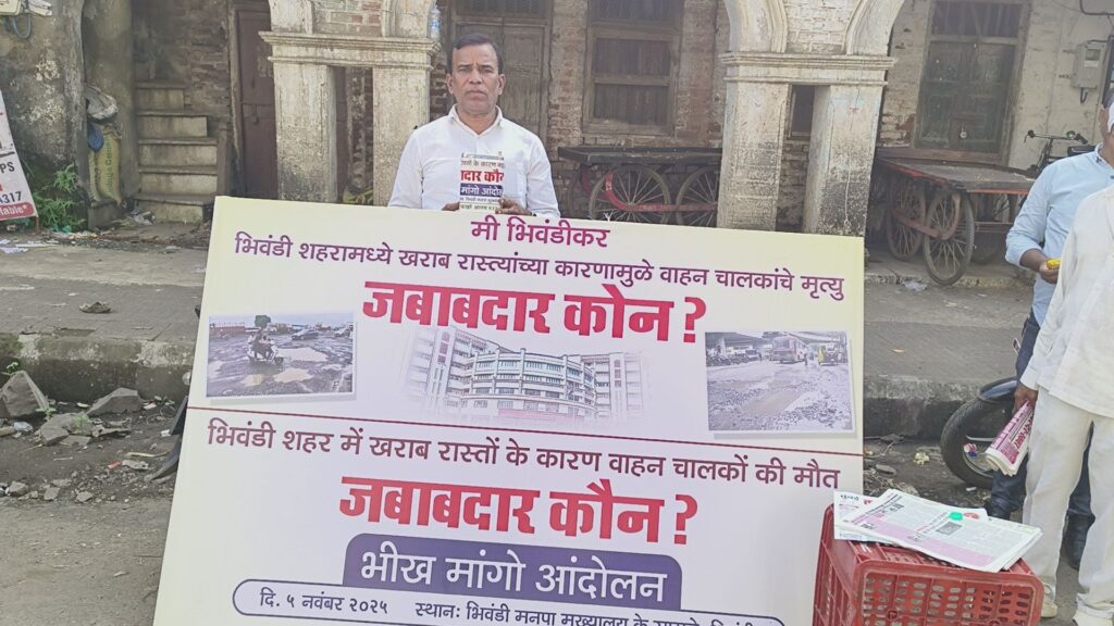 भिवंडी।। शहर की जर्जर सड़कों और उनसे हो रहे सड़क हादसों के खिलाफ नागरिकों ने अब खुलकर आवाज़ उठानी शुरू कर दी है। इसी कड़ी में सोमवार को भिवंडी मनपा मुख्यालय के सामने “भीख मांगो आंदोलन” आयोजित किया गया, जिसमें नागरिकों ने नगर प्रशासन से सीधा सवाल किया — “वाहन चालकों की मौत का जवाबदार कौन?”