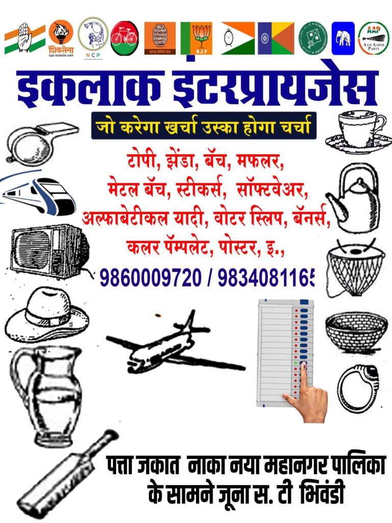 भिवंडी। आगामी मनपा चुनाव की सरगर्मियों के बीच शहर में चुनावी सामग्री की मांग में तेजी देखी जा रही है। जगह-जगह युवा विभिन्न राजनीतिक पार्टियों के कार्यालय और प्रचार केंद्र तैयार करने में जुटे हुए हैं। इसी कड़ी में जकात नाका, नई महानगर पालिका परिसर के सामने स्थित इक़लाक इंटरप्रायजेस ने चुनावी प्रचार सामग्री की विस्तृत रेंज उपलब्ध कराकर तैयारियां तेज़ कर दी हैं।