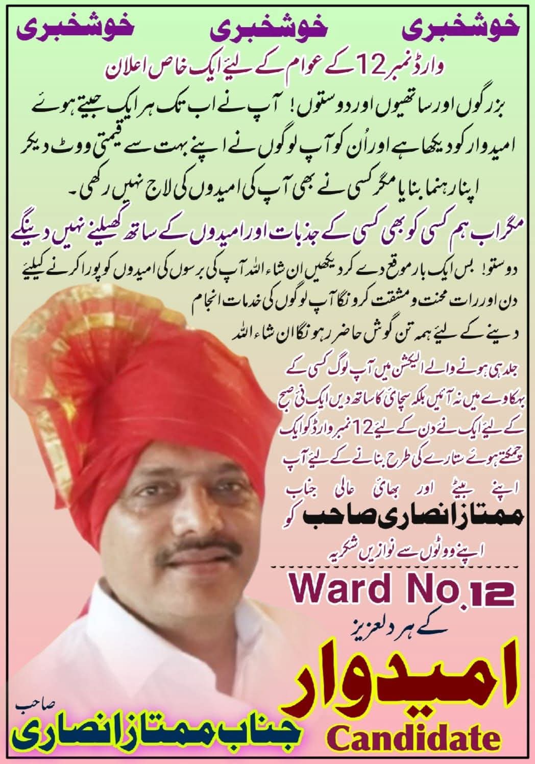 भिवंडी मनपा निकाय चुनाव को लेकर वार्ड संख्या 12 में चुनावी गतिविधियाँ तेज हो गई हैं। इसी क्रम में वार्ड नंबर 12 से मुमताज अंसारी ने आगामी चुनाव के लिए अपनी उम्मीदवारी की औपचारिक घोषणा की है। इस अवसर पर उन्होंने क्षेत्रवासियों को संबोधित करते हुए कहा कि वे अब तक जनता के सहयोग और विश्वास से सामाजिक व जनसेवा के कार्यों में सक्रिय रहे हैं और आगे भी पूरे समर्पण के साथ वार्ड के विकास के लिए कार्य करते रहेंगे।