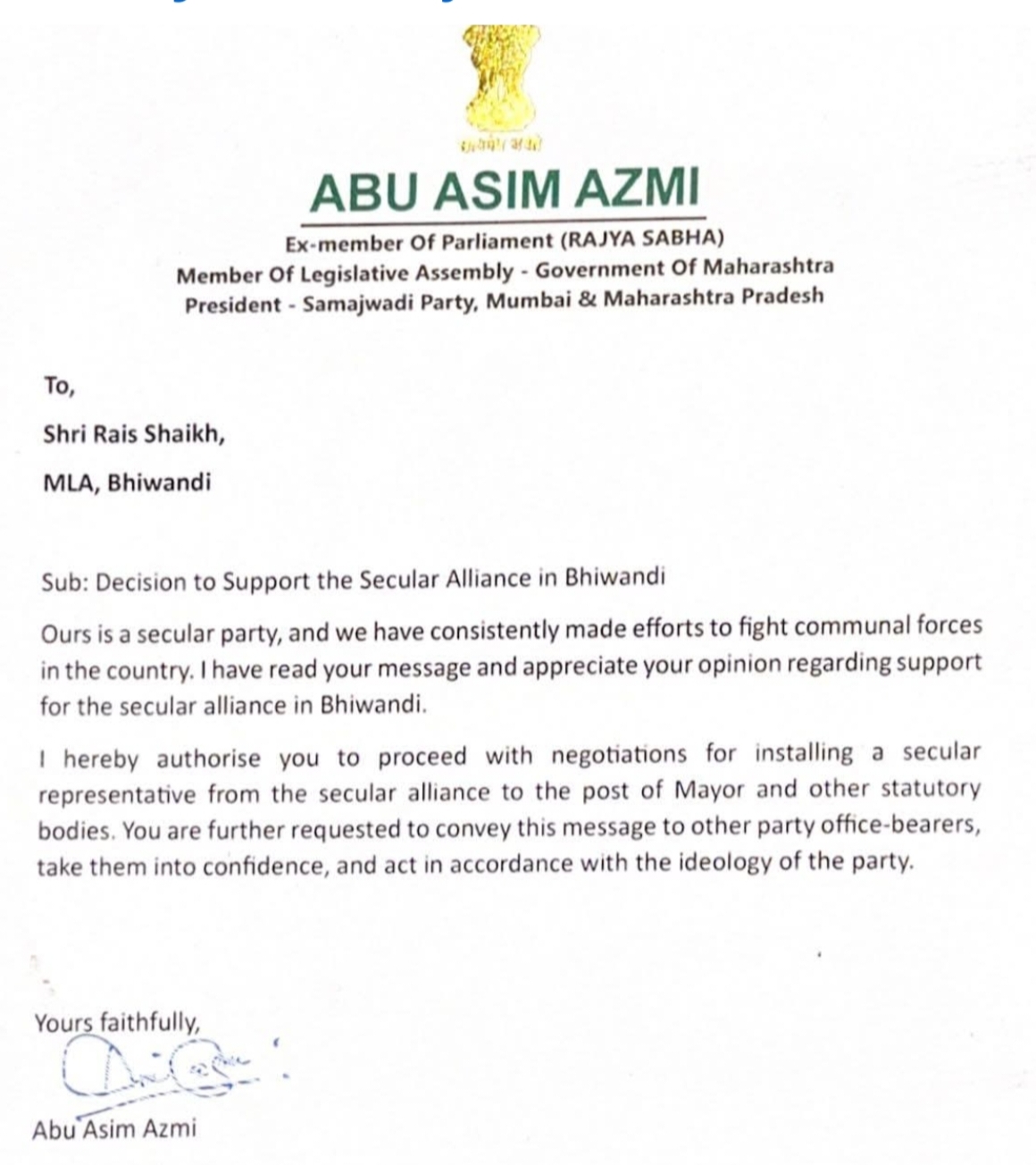 इस बीच समाजवादी पार्टी के प्रदेश अध्यक्ष और विधायक अबू आसिम आज़मी द्वारा रईस शेख को भेजा गया पत्र भी सामने आया है। पत्र में अबू आसिम आज़मी ने साफ कहा है कि समाजवादी पार्टी एक सेक्युलर पार्टी है और देश में सांप्रदायिक ताकतों के खिलाफ लगातार संघर्ष करती रही है। उन्होंने रईस शेख की राय की सराहना करते हुए उन्हें भिवंडी में सेक्युलर गठबंधन की ओर से मेयर और अन्य वैधानिक पदों के लिए बातचीत आगे बढ़ाने का अधिकार दिया है।