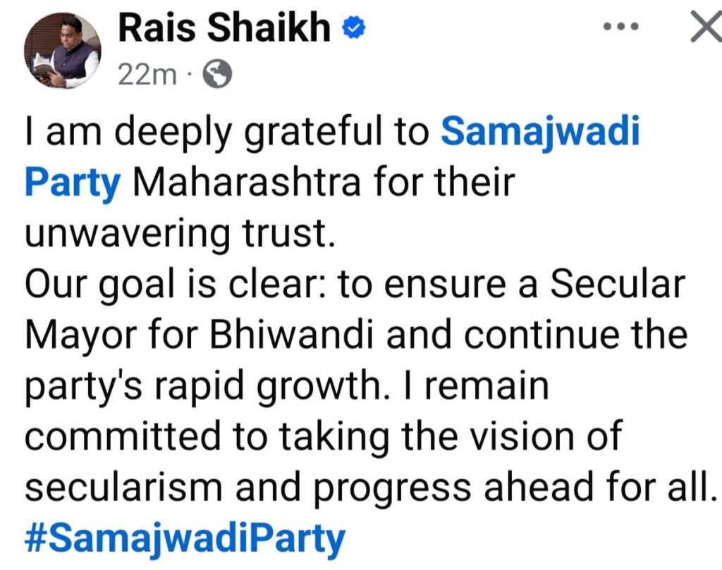 रईस शेख ने फेसबुक पोस्ट में लिखा कि समाजवादी पार्टी महाराष्ट्र ने उन पर जो भरोसा दिखाया है, उसके लिए वह आभारी हैं। उनका लक्ष्य स्पष्ट है—भिवंडी में एक धर्मनिरपेक्ष (सेक्युलर) मेयर का चुनाव सुनिश्चित करना और पार्टी के बढ़ते जनाधार को और मजबूत करना। उन्होंने कहा कि वह धर्मनिरपेक्षता और विकास के विजन को सभी वर्गों तक ले जाने के लिए प्रतिबद्ध हैं।