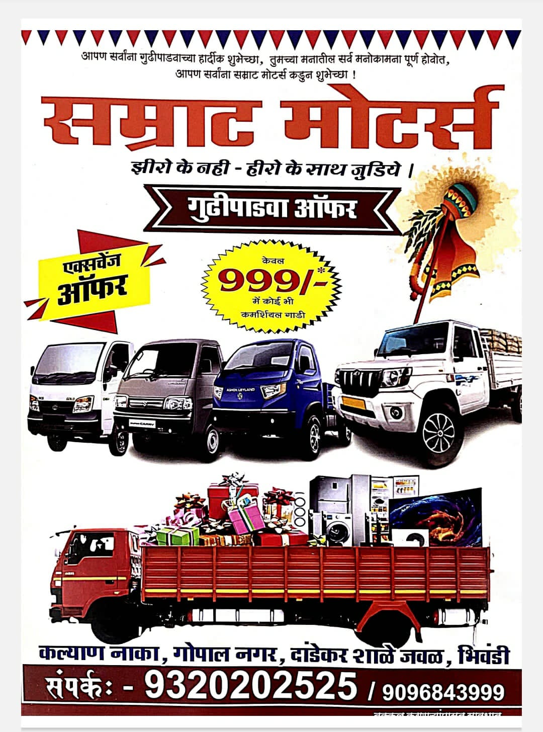 भिवंडी। गुड़ीपाड़वा के अवसर पर भिवंडी के कल्याण नाका स्थित गोपाल नगर में संचालित ‘सम्राट मोटर्स’ ने ग्राहकों के लिए आकर्षक ऑफर की घोषणा की है। संस्था की ओर से जारी विज्ञापन में दावा किया गया है कि मात्र 999 रुपये में किसी भी कमर्शियल गाड़ी की बुकिंग की जा सकती है। इस घोषणा के बाद स्थानीय व्यापारियों और छोटे व्यवसायियों में उत्सुकता देखी जा रही है।