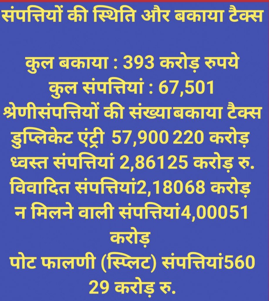 मनपा के सामने टैक्स वसूली बड़ी चुनौती बनी हुई है। शहर की 67,501 संपत्तियों पर कुल 393 करोड़ रुपये का बकाया टैक्स है।